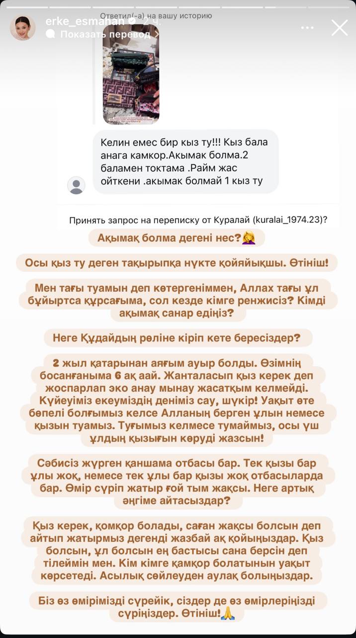 "Келін емес, бір қыз ту!!! Қыз бала анаға қамқор. Ақымақ болма. 2 баламен тоқтама. Райм жас өйткені. Ақымақ болмай 1 қыз ту", - деп жазды ол.