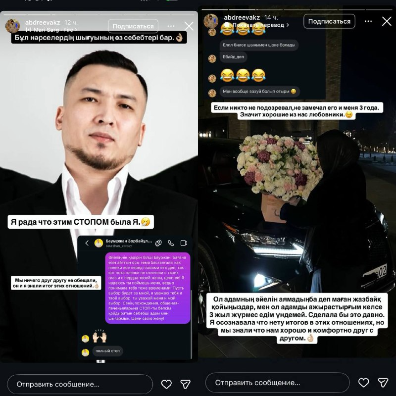 «Әйеліңнің қадірін біл, Бауыржан. Бұл жайлы сөз қозғалғанда, барлығы көз алдымнан өтті. Сенің жүрегің мен жаныңда сол сәттер өшпей тұрғанда бағала. Мен де сені түсінуге тырыстым. Өз таңдауымды қабылдадым, сенің таңдауыңды құрметтедім. Сен де менің шешімімді сыйла. Сенің жүріс-тұрысыңа, басқа қыздармен араласуыңа “стоп” қоя алатын адам – мен», – деп жазды ол.